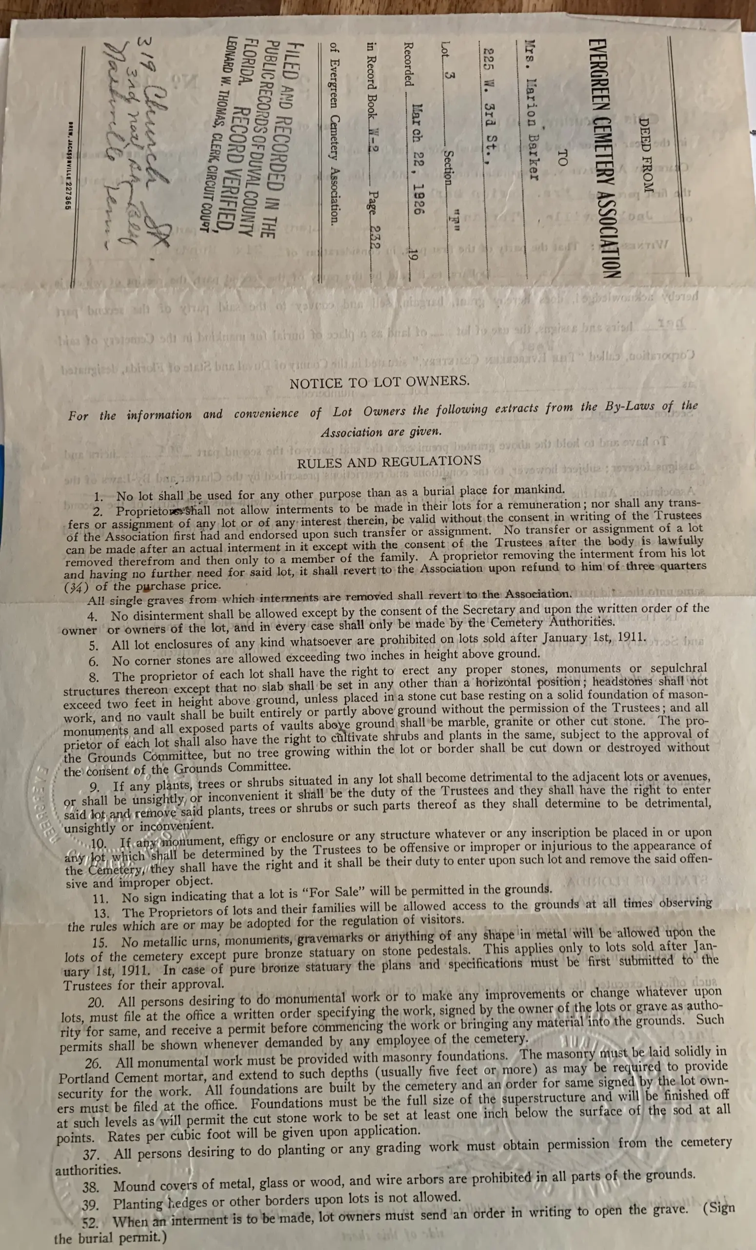 There are two grave sites, #7 & #8, side by side (and are to be sold together) in West Evergreen, Section F, Lot 3 that are available.  Per Administrative Staff at Evergreen Cemetery, there no other grave sites in this area of West Evergreen that are available.  This area of the Cemetery is surrounded by the shade of old growth trees and flowering shrubs.